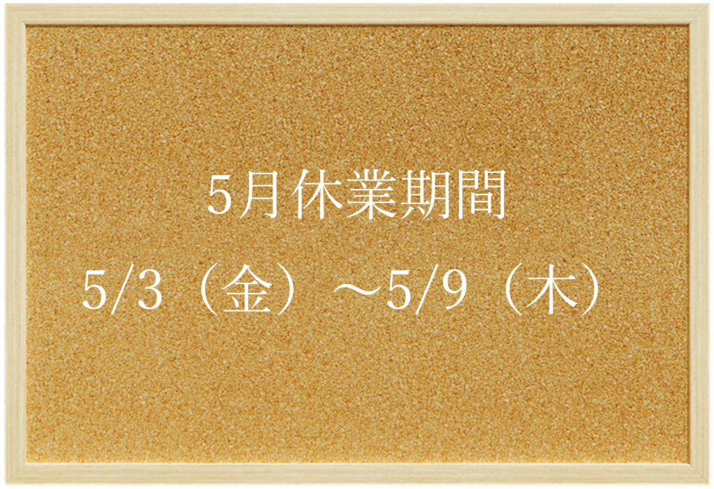 2024.04.18 お知らせ5月GW休業のご連絡 2024年5月3日(金)~9日(木)まで休業いたします。レッスンのご予約は通常通り受付しております。尚、休業中は予約確定メールの返信が遅れる場合がございますのでご了承ください。