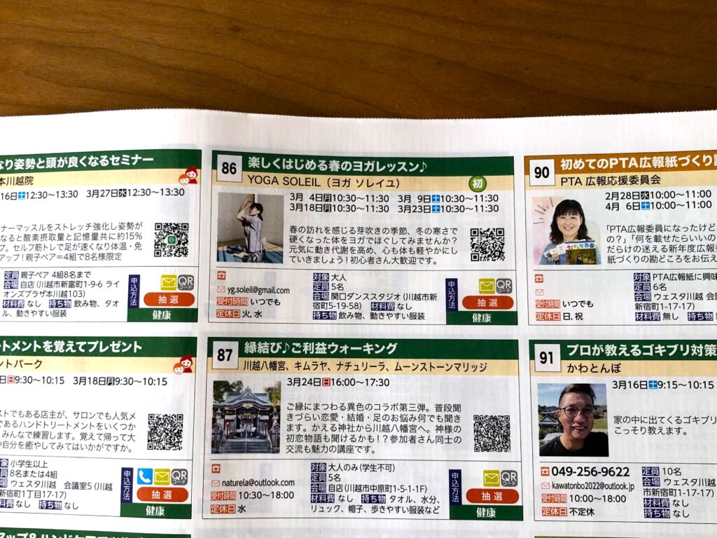 川越市内で事業を行う方々が講師となって、お客様に無料で講座を開催しちゃうスペシャルなイベントです☆スタンプラリーに参加すると、抽選でステキな商品も当たるというお得な『川越まちゼミ』です。私もヨガレッスンを提供いたしますので、ぜひご参加くださいね!(講座番号86番に掲載されています)